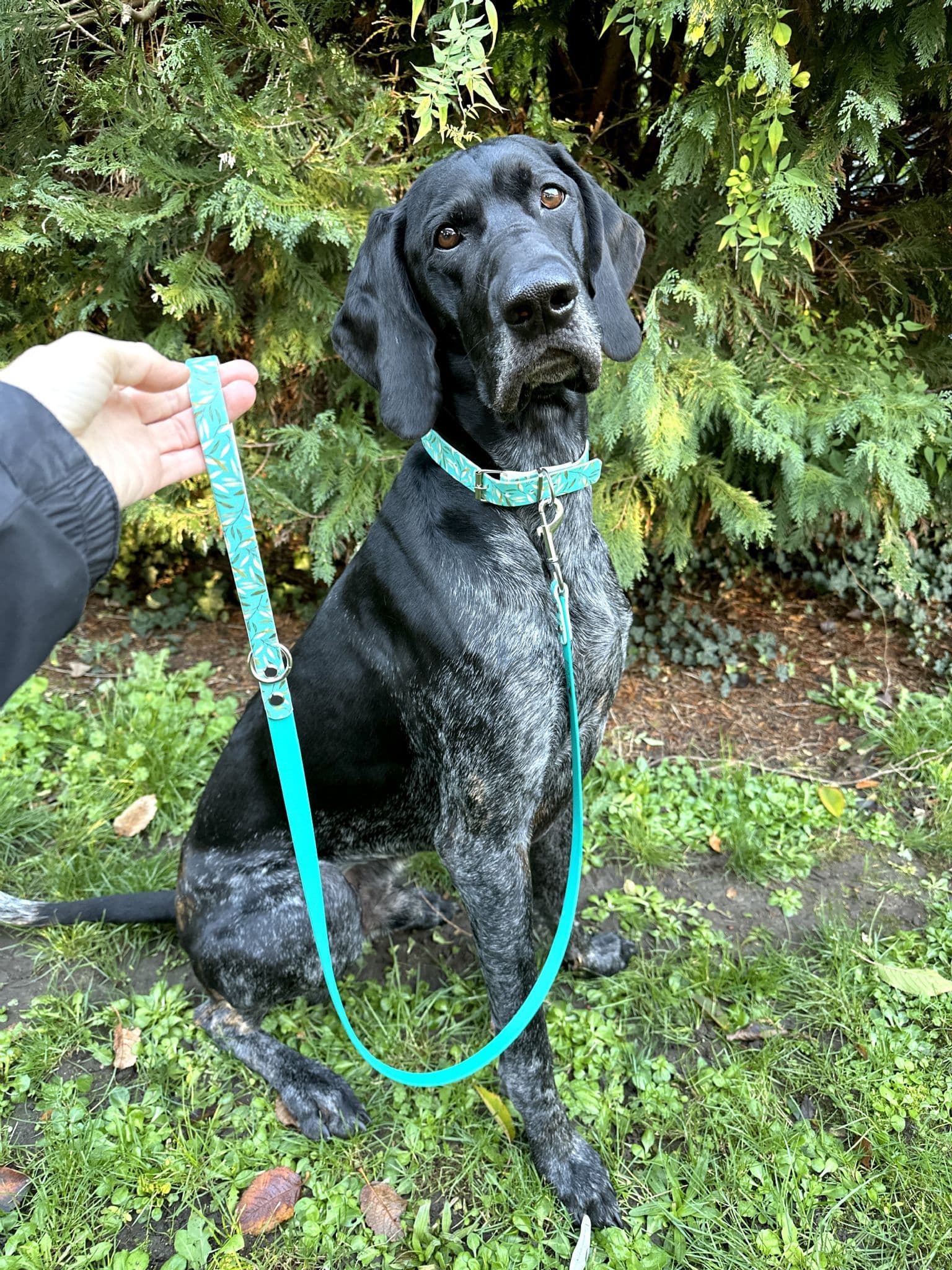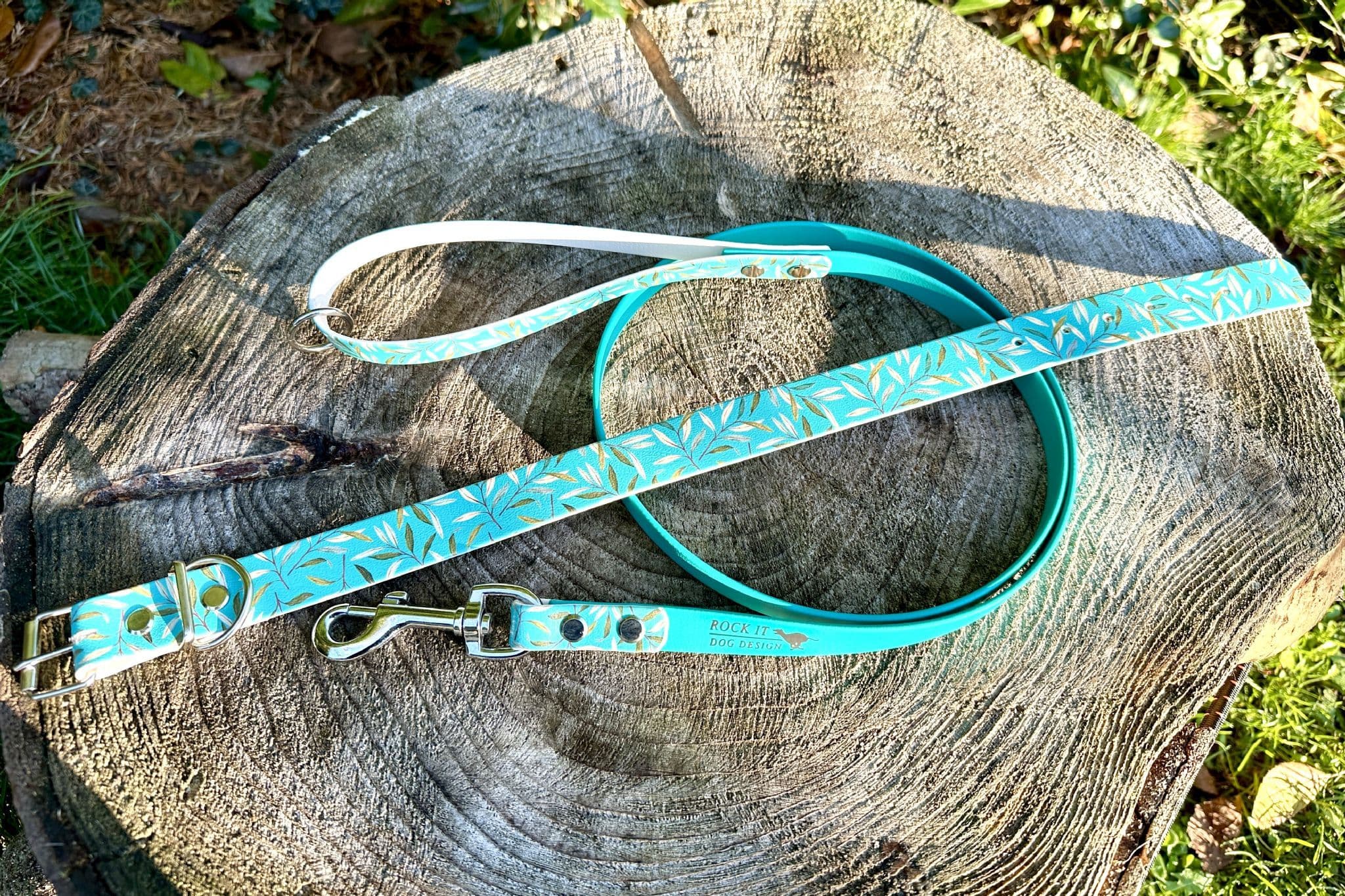 You also have the option to add a matching lead, the main length of the lead is available in either teal (as pictured) or if your prefer a custom colour please email us at rockitdogdesign@gmail.com, the handle and small patch down by the trigger hook is in the Teal Leaves design. Due to the printing process it’s not possible to offer a whole length lead in the Teal Leaves design, hence this type of design.