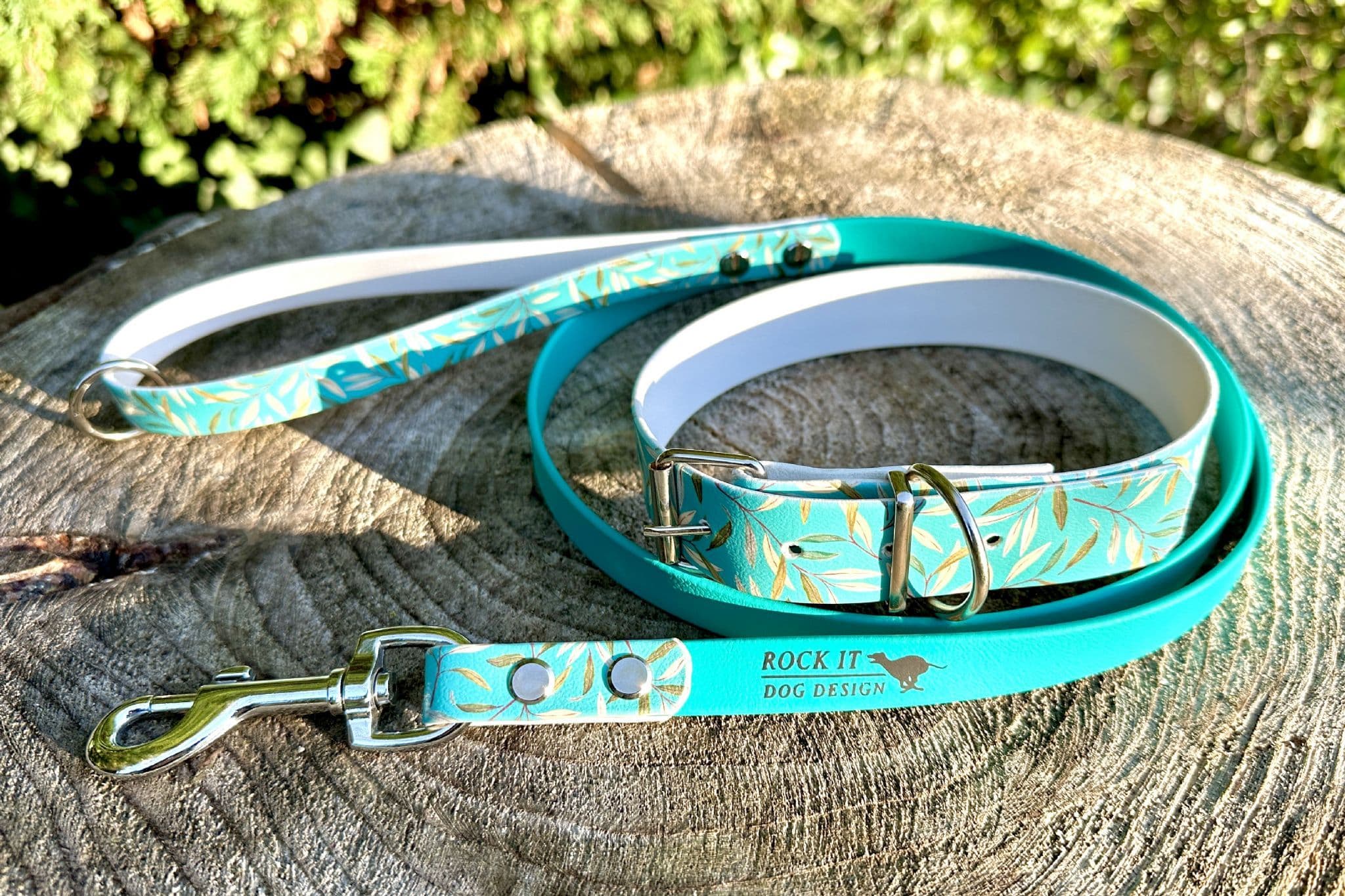 A beautifully handmade Biothane collar with a stylish printed Teal Leaves design in a variety of sizes suitable for all dogs, from small to large breed dogs.